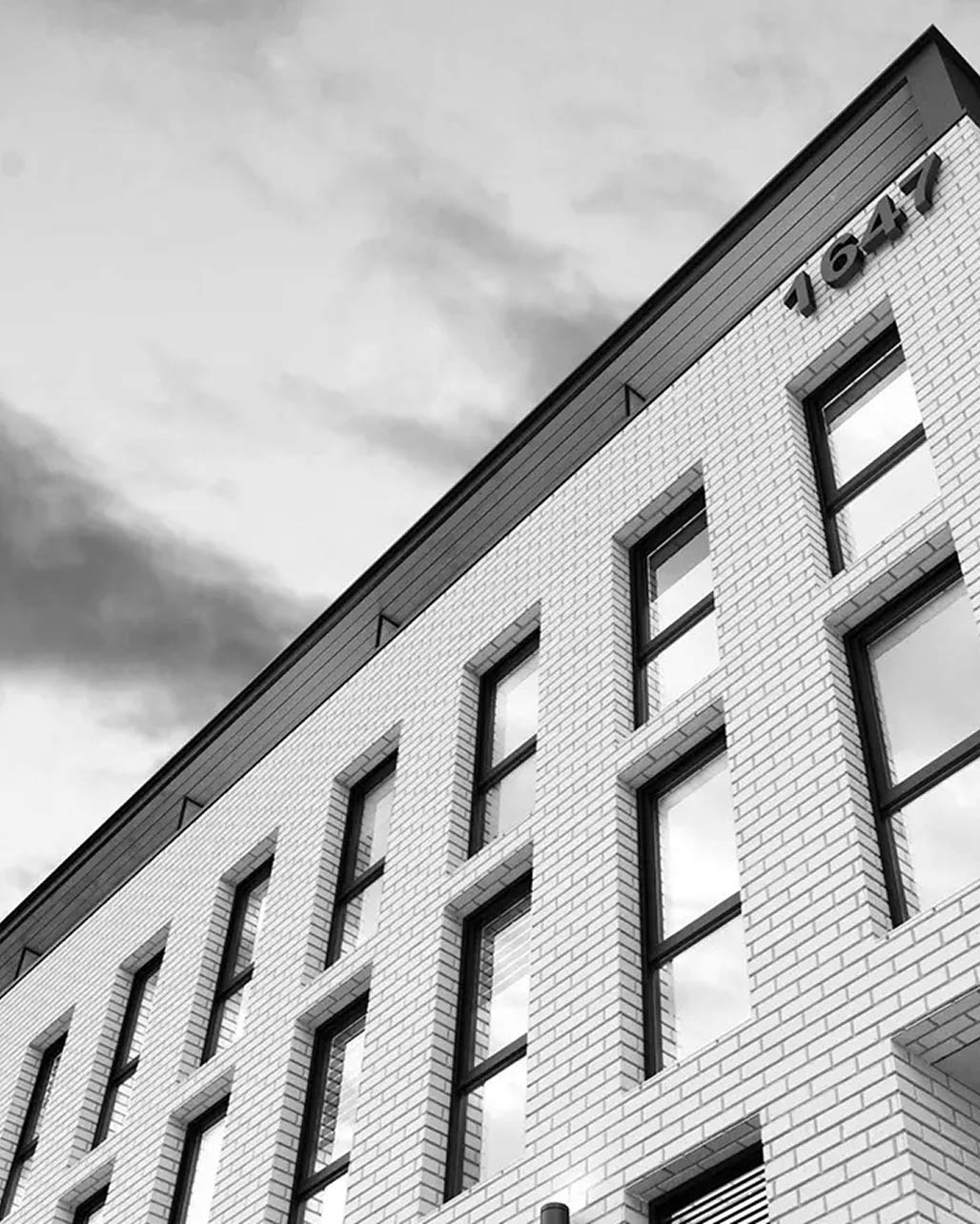 The building is defined by its white-brick exterior, with black steel accents and tall windows that draw natural light inside.